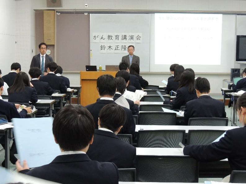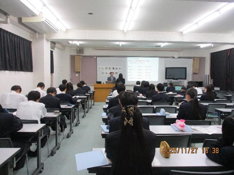 11月27日にがん教育講演会を行いました。講演会では、5年前に膵臓がんを患った鈴木さんをお招きし、闘病当時の状況や、がんに関する詳しいお話を伺いました。
